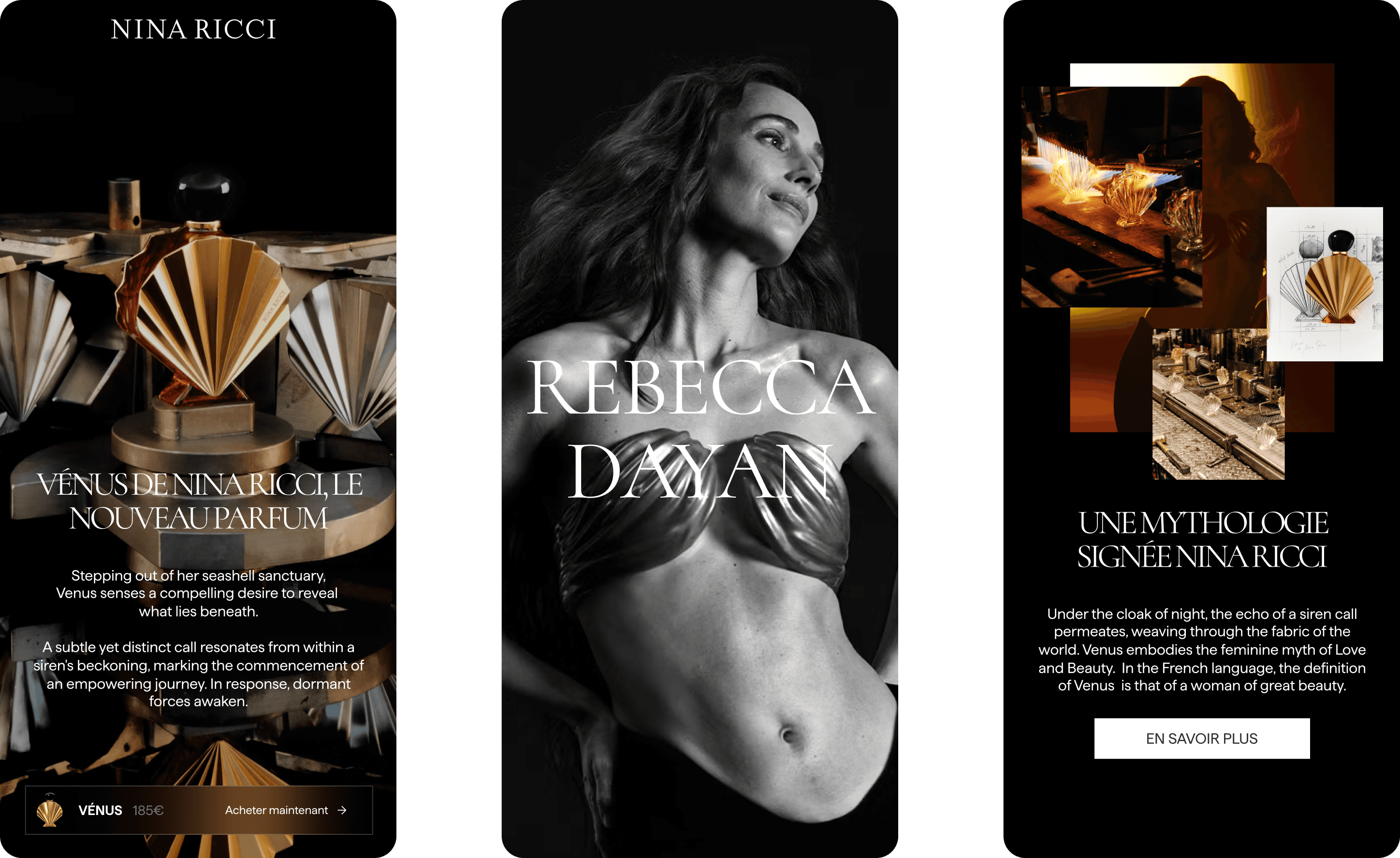 Designing a launch website was created to introduce Nina Ricci’s new fragrance Venus, featuring Rebecca Dayan as its face. The storytelling was supported through an extensive use of scroll animations, designed to gradually reveal imagery, text, and details in a flowing sequence. This interactive approach guided visitors step by step through the narrative, highlighting both the fragrance’s essence and the craftsmanship of the unique bottle.